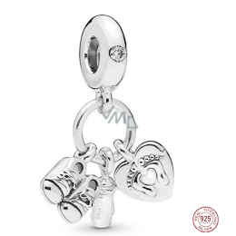 Charm Sterlingové stříbro 925 Moje děťátko 3v1 srdce - tisk nohou, dudlík a botičky, přívěsek na náramek rodina