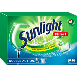 Tablety Sunlight All in 1 jsou ideálním pomocníkem pro ty, kteří chtějí efektivně využívat volný čas. Tablety Sunlight All in 1 obsahují vše, co potřebuje vaše myčka a nádobí. Chcete důkladně vyčistit zaschlou špínu či odolnou mastnotu? Nebo potřebujete dodat skleničkám, talířům a dalšímu příslušenství maximální lesk, aniž by došlo k poškození jejich citlivých povrchů? Odpovědí na všechny tyto otázky jsou tablety Sunlight All in 1. Díky nim vám navíc odpadnou i další výdaje na leštidlo či sůl, všechny tyto složky, které napomáhají k zajištění dokonalého výsledku, jsou v nich totiž již obsažené. A aby toho nebylo málo, kromě bezchybné čistoty a lesku, bude vaše nádobí po umytí vonět svěžím aroma.