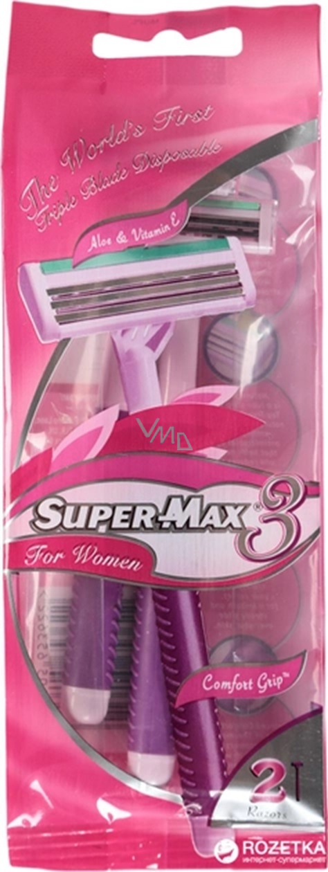 Jednorázové holítko se třemi břity Super-Max Triple Blade 3 For Women. Trojitá čepel a plovoucí hlava urychlují proces a zlepšují kvalitu holení. Čepel je broušena pomocí technologie ION EDGE, která zajišťuje ostrost a dlouhou životnost. Lubrikační vitamínový proužek s Aloe Vera a vitamínem E snižuje podráždění pokožky a zajišťuje hladký skluz. Pohodlná rukojeť s na dotek příjemným povlakem Soft Touch a žebrovaným povrchem zabraňuje vyklouznutí žiletky z ruky.