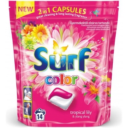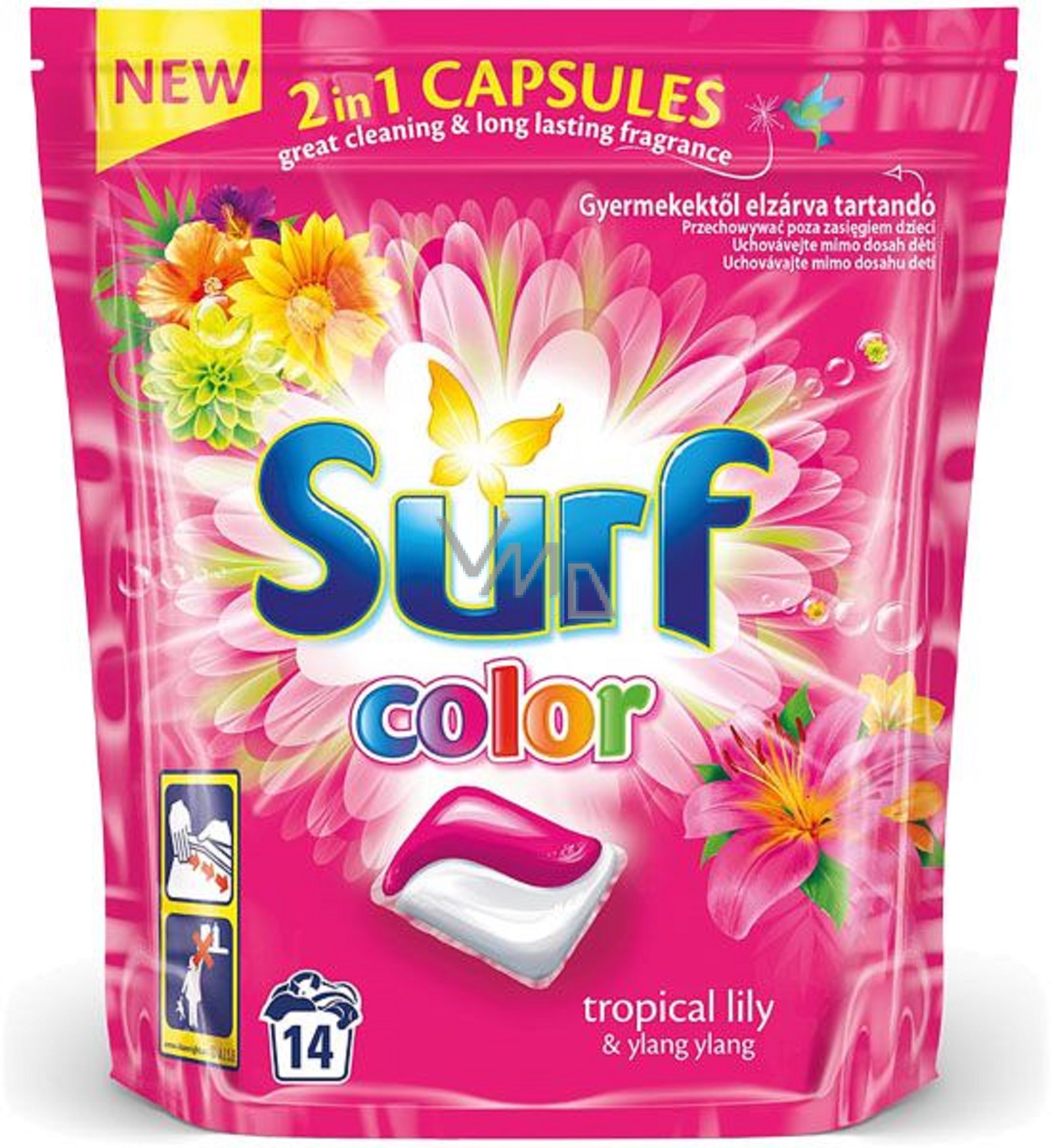 Gelové kapsle na praní Surf Color Tropical 2 v 1 jsou určeny pro praní barevného prádla, kterému věnují potřebnou péči. Hravá kombinace vůní tropické lilie a ylang ylang vás potěší při každém praní stejně jako dokonalá čistota prádla. Nechte se unášet na vlnách květinových akcentů po celý rok.