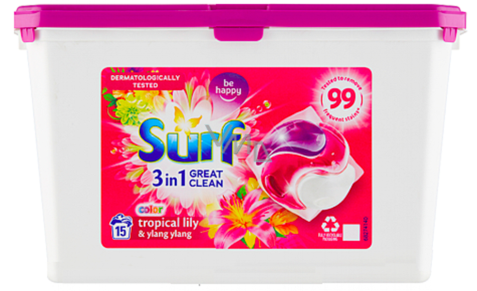Opis Surf Color Tropical Lily & Ylang Ylang gelové kapsle na praní barevného prádla 15 dávek 318 g