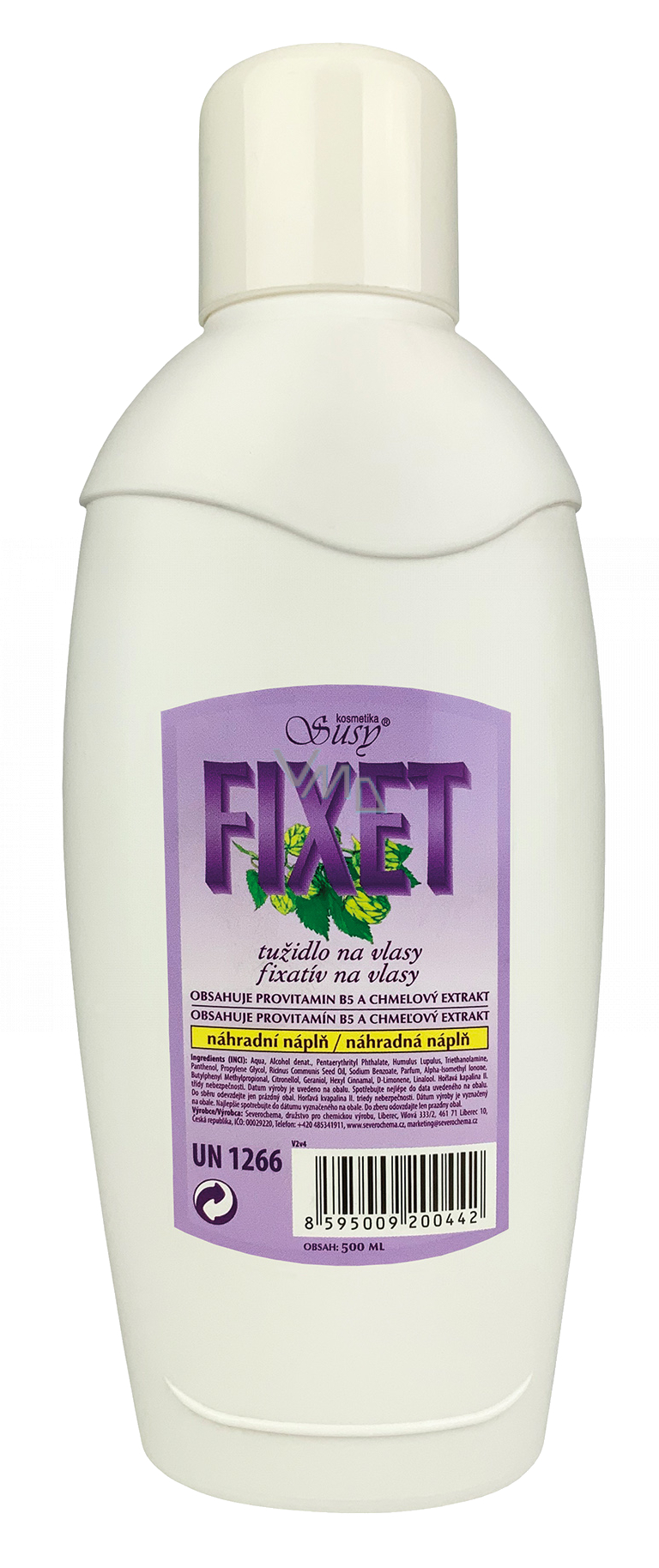 Aqua, Alcohol denat., Pentaerythrityl Phthalate Dea, Panthenol, Parfum, Peg-40, Hydrogenated Castor Oil, Sodium Benzoate, Humulus Lupulus, Citronellol, Hydroxycitronellal, a-isomethyljonon, d-limonene, Linalool. Hořlavý.