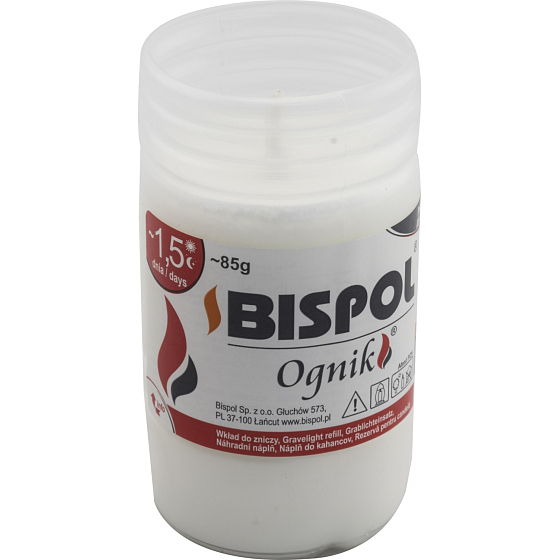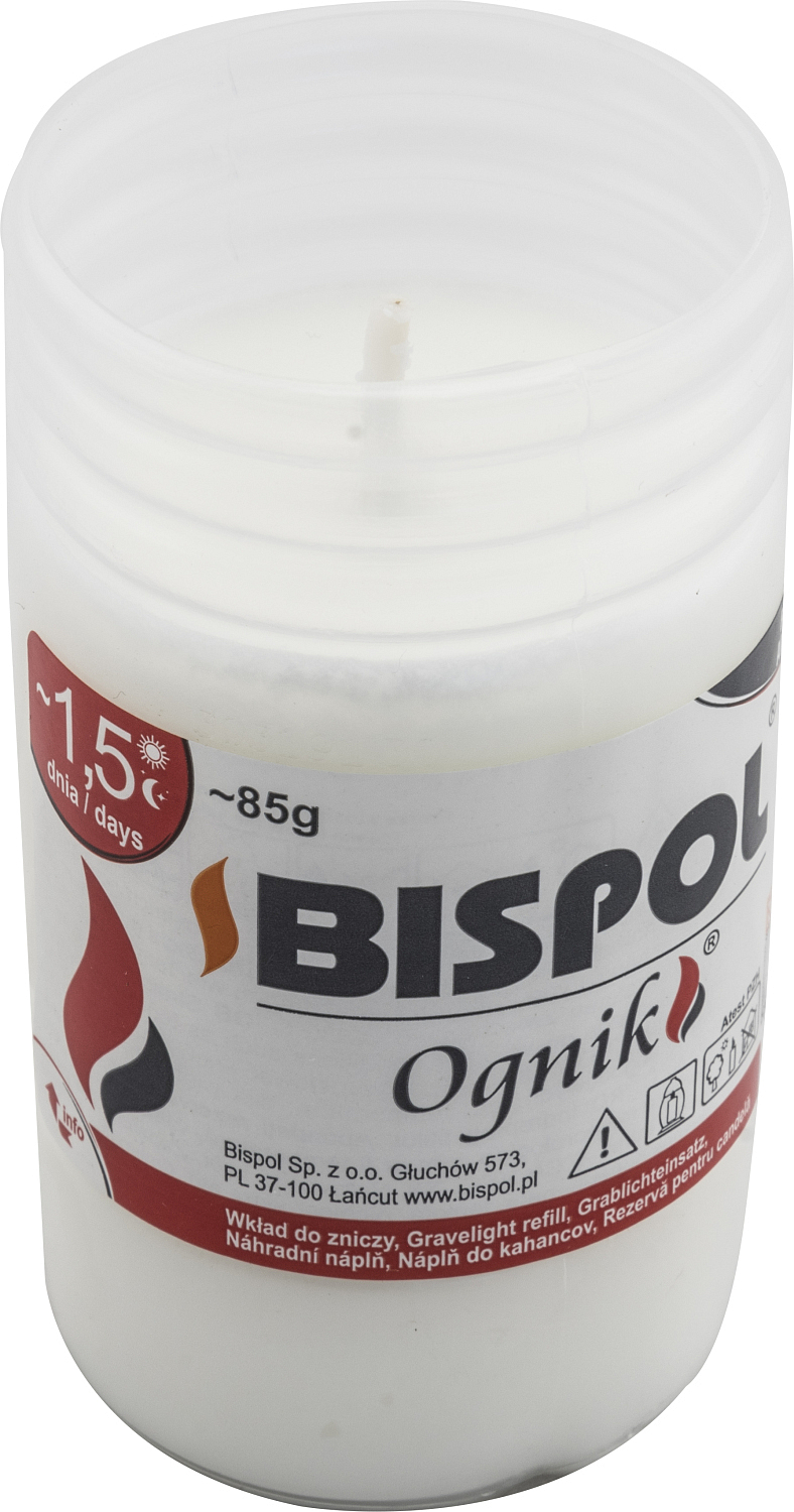 Bispol OGNIK świeca olejowa WP0. Szczególnie odpowiednia jako wkład do zniczy cmentarnych. Bardzo wysoka jakość świecy, która 100% spali się.