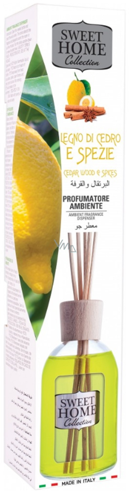 Sweet Home dyfuzor zapachowy z cedrowym drewnem i przyprawami oferuje doskonałe intensywne, a jednocześnie niedrażniące zapachy dyfuzorów zapachowych Sweet Home, które są idealne do domów, takich jak: przedpokoje, łazienki, sypialnie, biura lub salony. Te intensywne i wysokiej jakości zapachy dyfuzory produkcji włoskiej są również doskonałe do wspólnych przestrzeni, takich jak korytarze, holle, recepcje itp. Do szklanego flakonu dyfuzora wkładasz dołączone bambusowe patyczki, a zapach zaczyna powoli uwalniać się do przestrzeni. Intensywność zapachu można regulować liczbą użytych patyczków, a dla maksymalnego efektu regularnie je obracaj, co pozwoli na uwolnienie więcej perfum do przestrzeni.