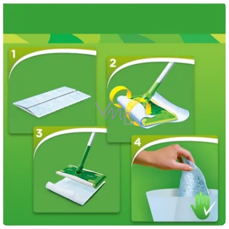 Gdy pozbędziesz się kurzu, nadszedł czas na ściereczki czyszczące. Ściereczki czyszczące rozpuszczają brud, pochłaniają i usuwają go z podłogi, którą pozostawiają czystą i świeżo pachnącą. Swiffer Sweeper ma obracającą się głowicę 360°, dzięki której możesz wyczyścić wszystkie miejsca, nawet te trudno dostępne (pod lodówką, piekarnikiem i zmywarką, pod łóżkiem lub kanapą) lub w rogach, gdzie zwykłe miotły i mopy zazwyczaj się nie dostają. Nie używaj ściereczek czyszczących Swiffer Sweeper na surowych, olejowanych lub woskowanych drewnianych powierzchniach, ani na nieklejonych płytkach lub dywanach.