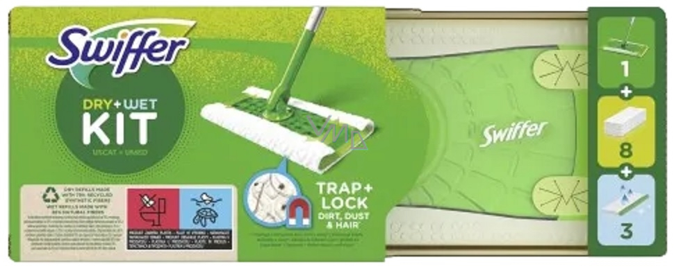 W końcu masz rozwiązanie do zamiatania i mycia podłóg w jednym. Zestaw startowy Swiffer Sweeper zawiera 8 mocnych ściereczek, które wychwytują 3 razy więcej brudu, kurzu, włosów i sierści niż tradycyjne miotły. Możesz je także używać jako uzupełnienie do odkurzacza, aby wychwycić nieodkurzony drobny kurz, lub jako trik do szybkiego sprzątania między dokładnymi porządkami. Ściereczki mają działanie elektrostatyczne, które w połączeniu z ich mocą i specyficznym wzorem pozwala na wychwycenie całego kurzu.
