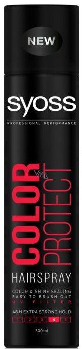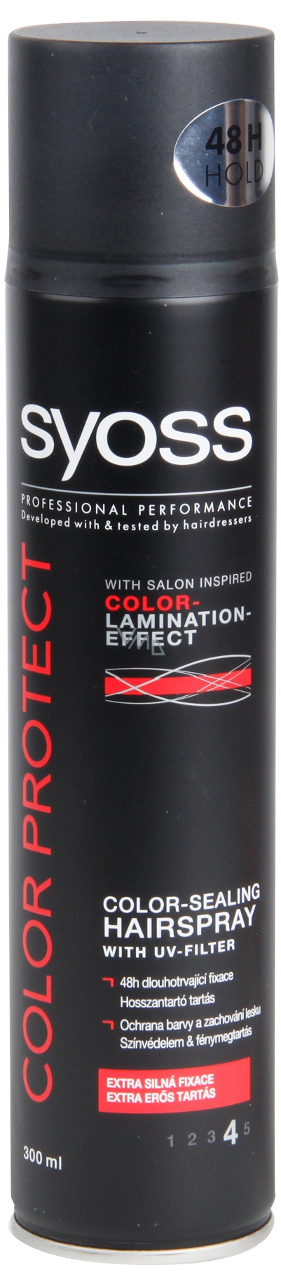 Ochrana barvy a zachování lesku. SYOSS Color Protect profesionální stylingová řada se salonem inspirovanou technologií laminace barvy a UV filtrem, který pomáhá chránit barvu před vyblednutím, zintenzivňuje její lesk a zároveň poskytuje extra silnou fixaci. 48h kontrola účesu pro barvené vlasy s extra silnou fixací. Pomáhá chránit vlasy před vlhkostí a UV zářením.