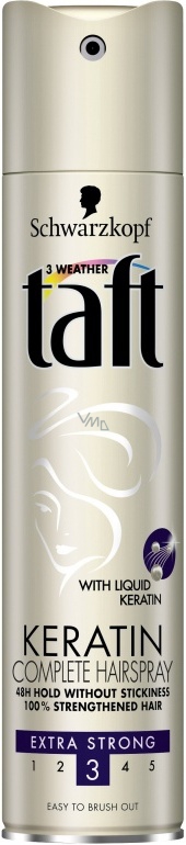 Lak na vlasy Taft Keratin Complete je k dostání se stupněm fixace 3 (extra silný) nebo 4 (ultra silný). Účinné látky vytváří kolem vlasů ochranný štít. Ten je pomáhají chránit před vnějšími vlivy, jako je UV záření a vlhkost. Vlasy jsou pak stoprocentně posílené a zpevněné až na 48 hodin a přitom se snadno rozčesávají.