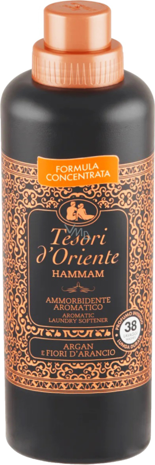 Tesori d'Oriente to skoncentrowany płyn do płukania o oszałamiającym zapachu. Tesori otuli Twoje pranie i ubrania zmysłowym uściskiem, pozostawiając je pięknie perfumowane i miękkie. Płyn do płukania Tesori Hammam Argan e Fiori d'Arancio składa się z delikatnych tonów jaśminu i kwiatów pomarańczy. Jest wzbogacony o cenne mikrokapsułki zapachowe, które przy każdym ruchu stopniowo uwalniają swój intensywny zapach.