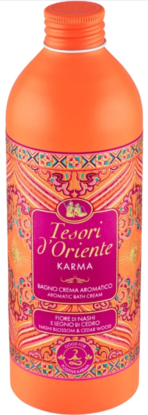 Tesori d´Oriente piana do kąpieli Karma pozostawia twoją skórę delikatną, czystą i gładką w dotyku. Piana do kąpieli jest inspirowana starożytnymi tradycjami hinduskimi. Energiczne akordy cytryny, bergamotki, wesołe kwiatowe nuty kwiatów nashi (gruszka chińska) oraz kojące nuty drewna cedrowego harmonijnie oczyszczają skórę i rozpieszczają twoje zmysły.