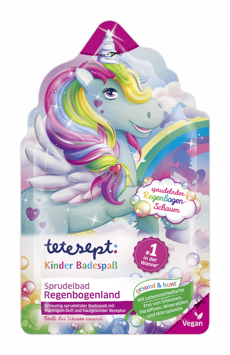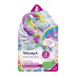 Tetesept perličková kąpiel Tęczowy świat zawiera recepturę specjalnie przystosowaną dla wrażliwej dziecięcej skóry z masłem kakaowym pielęgnującym skórę i zapachem owocowych jagód. Nieszkodliwy barwnik spożywczy zmienia pienią na kolorową. Zawiera składnik, który w bąbelkowej kąpieli tworzy tęczowy efekt i tworzy kolorową pianę.