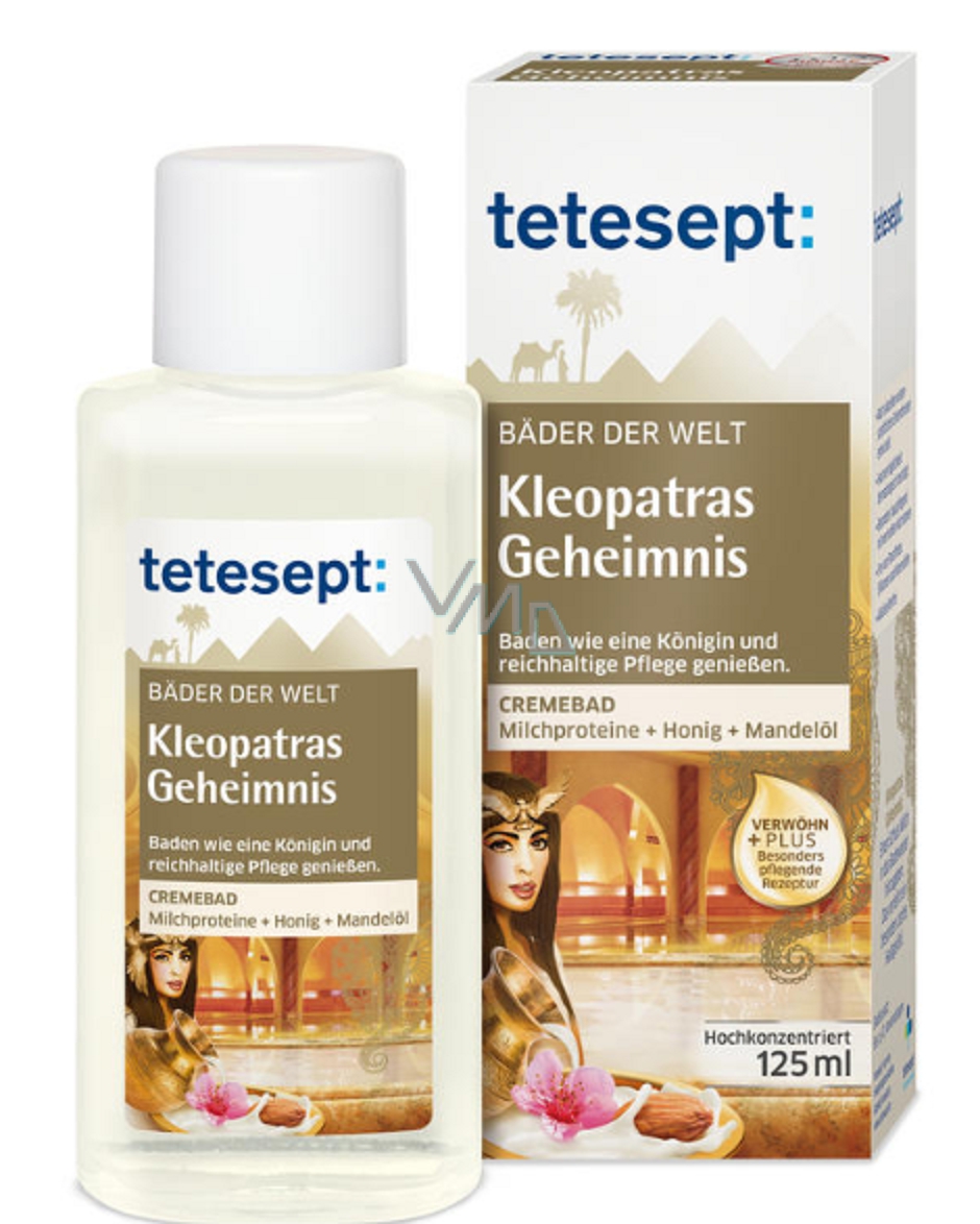 Zažijte wellness momenty ve vaší vlastní vaně:- koupel "Kleopatřino tajemství" Koupat se jako královna a užívat si bohaté péče: tajná koupel tetesept Cleopatra se složením vybraných mléčných bílkovin vyhlazuje pokožku. Koupele tetesept obsahují cenné lázeňské liposomy získané z přírodních zdrojů s jedinečným efektem dvojí péče: okamžitá péče a dlouhodobý účinek.