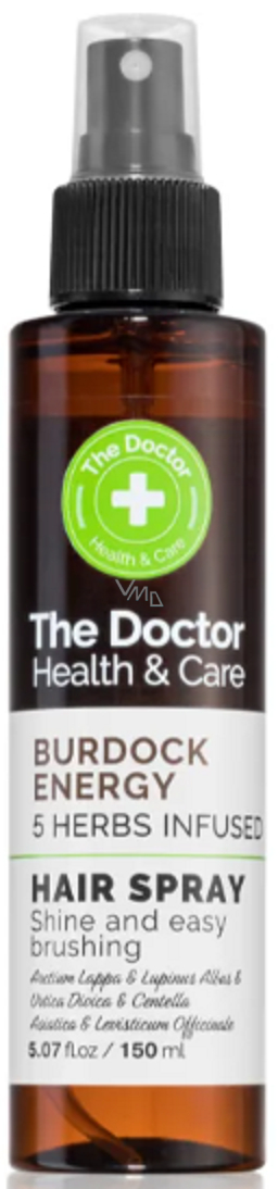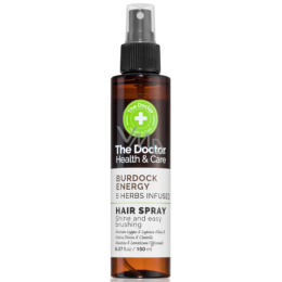 Vitalizující sprej The Doctor Health & Care Burdock Energy je vysoce účinným produktem pro posílení vlasů, které trpí vypadáváním. Složení spreje obsahuje pět účinných bylinných extraktů - lopuch, kopřivu, lupinu, pupečník a libeček, které hydratují vlasy, dodávají jim lesk a usnadňují rozčesávání. Lopuch pomáhá vyživit pokožku hlavy a podporuje růst vlasů, zatímco kopřiva posiluje vlasy a zlepšuje jejich zdraví. Lupina chrání vlasy před poškozením a zvyšuje objem vlasových vláken. Pupečník podporuje cirkulaci krve v pokožce hlavy, což napomáhá růstu vlasů, a libeček obsahuje minerály, které jsou také důležité pro růst a pevnost vlasů.