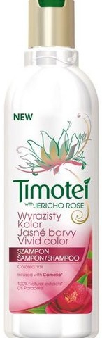 Šampon Timotei Jasné barvy obohacený o přírodní výtažky z kaméliového oleje chrání a vyživuje barvené vlasy, aby si zachovaly jas a barvu déle. Šampony Timotei v sobě spojují blahodárné účinky přírodních extraktů, a poskytují tak vlasům péči, která podpoří jejich přirozenou krásu. Timotei používá alternativní konzervační látky a přírodní ingredience, které mají dlouhou trvanlivost bez použití chemických konzervantů (parabenů).