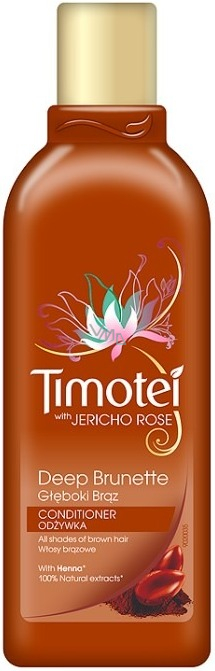 Kondicionér Timotei Nádherná bruneta obohacený o přírodní výtažky z henny (100% výtažky z henny), zvýrazňuje tmavě hnědé odstíny vlasů a zanechává je nádherně lesklé (při použití šamponu a kondicionéru). Nový k přírodě šetrný obal je plně recyklovatelný.