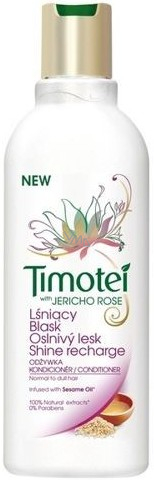 Kondicionér Timotei Oslnivý lesk oživuje matné vlasy a dodává jim přirozený lesk. Šampony Timotei v sobě spojují blahodárné účinky přírodních extraktů, a poskytují tak vlasům péči, která podpoří jejich přirozenou krásu. Timotei používá alternativní konzervační látky a přírodní ingredience, které mají dlouhou trvanlivost bez použití chemických konzervantů (parabenů).