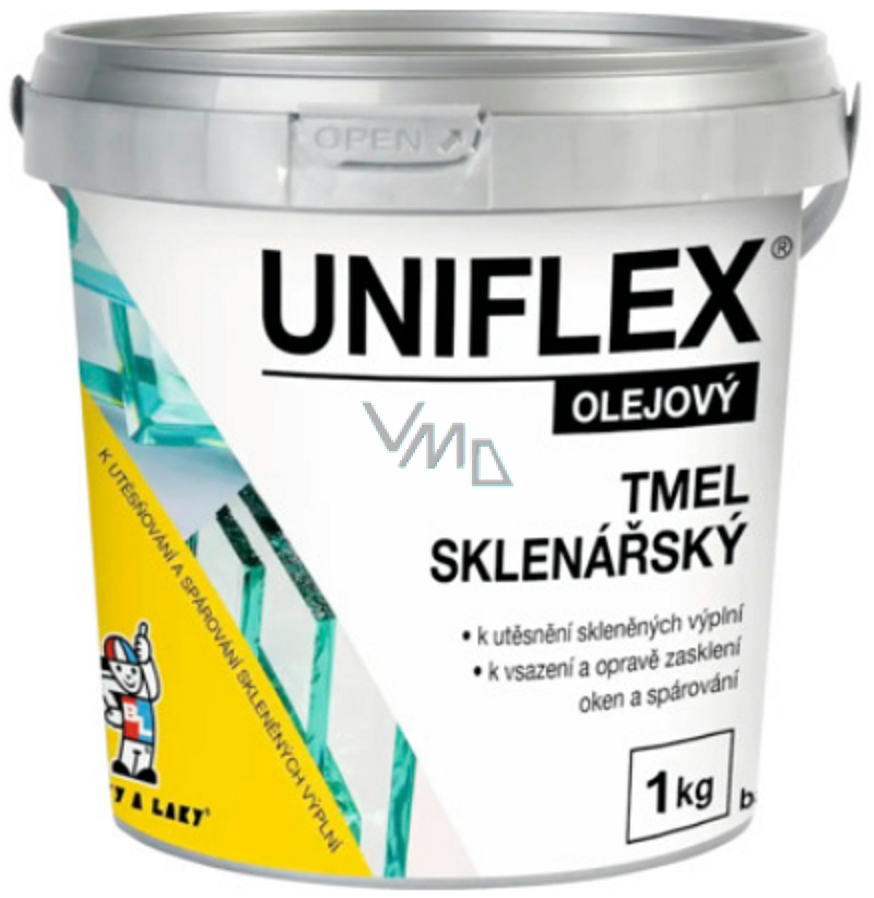 Uniflex olejový sklenářský tmel pro opravu drobných nerovností. Tmel povrchově zasychá do 24 hodin a je přetíratelný po 14 dnech. K utěsnění, upevňování tabulkových skel do dřevěných a kovových rámů. Dřevěný rám musí být před zasklíváním zbaven veškerých mechanických nečistot a musí být napuštěn a natřen základní barvou. Sklenářský tmel se nanese v tenké vrstvě do polodrážky a tabule skla se uloží tak, aby přilnula v celé ploše. Sklo se připevní příponkami a tmel se zatlačuje sklenářským nožem do polodrážky, v níž je uloženo sklo. Po zaplnění polodrážky se povrch tmelu uhladí.