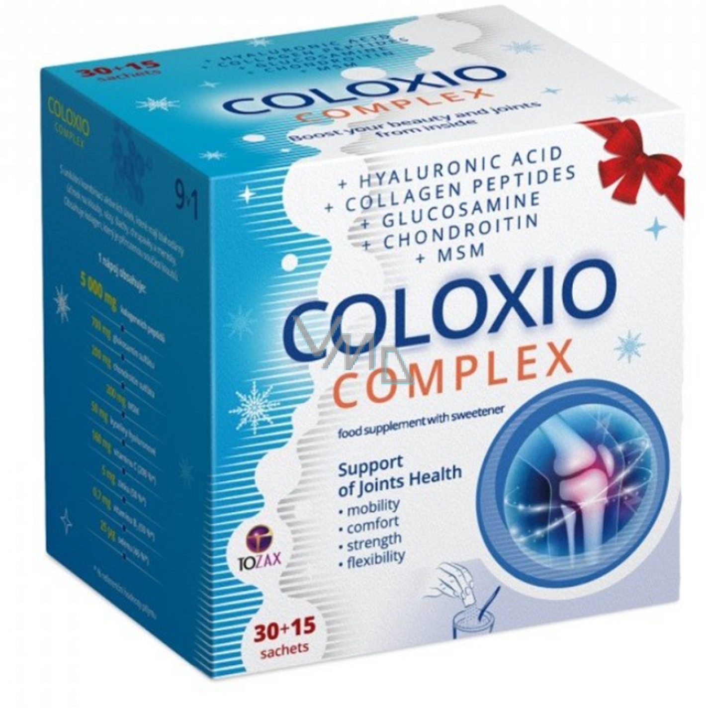 TOZAX Coloxio Complex je doplněk stravy ve formě sáčků. Obsahuje unikátní kombinaci aktivních látek. Obsažený kolagen je přirozenou součástí kloubů. V přípravku se taktéž nalézá Vitamin C, Zinek, Vitamin B2 a Selen.