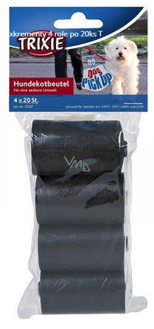 Balení obsahuje 4 roličky barevných plastových sáčků na trus. V jedné roličce je 20 ks sáčků. Uvedená cena je za celé balení.
