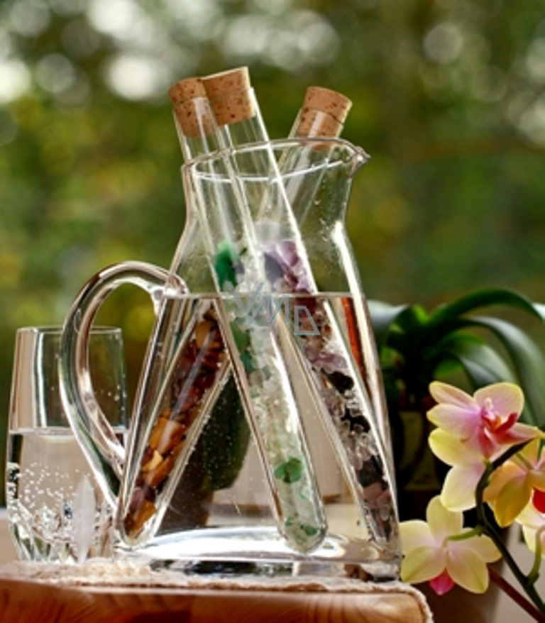 Nyní si krystalovou vodu můžete snadno připravit sami u sebe doma. Speciálně tvarovaná karafa z průzračného skla se sadou vybraných krystalů vám umožní upravovat si běžnou kohoutkovou vodu, kdykoli ji budete potřebovat. Karafa o objemu 1,2 litru je vyrobena sklářskými mistry z ručně foukaného skla.