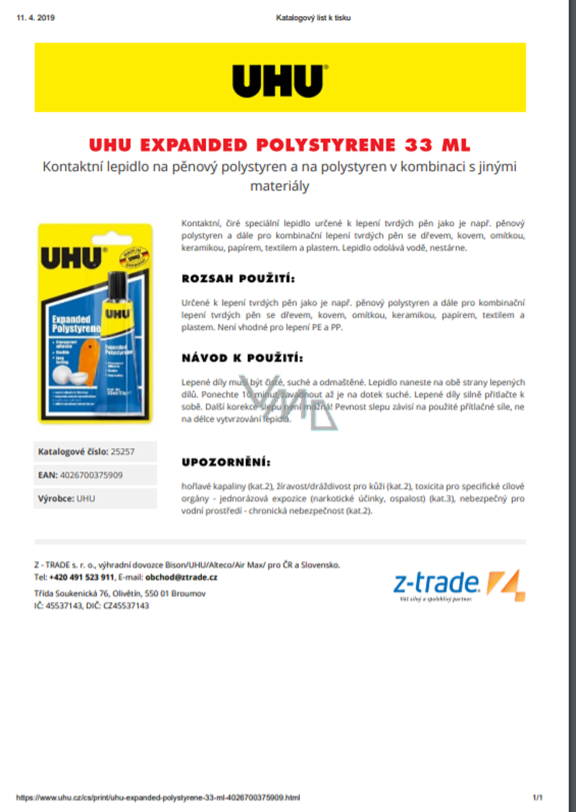 Uhu Expanded Polystyren klej kontaktowy do piankowego polistyrenu i polistyrenu w połączeniu z innymi materiałami 33 ml