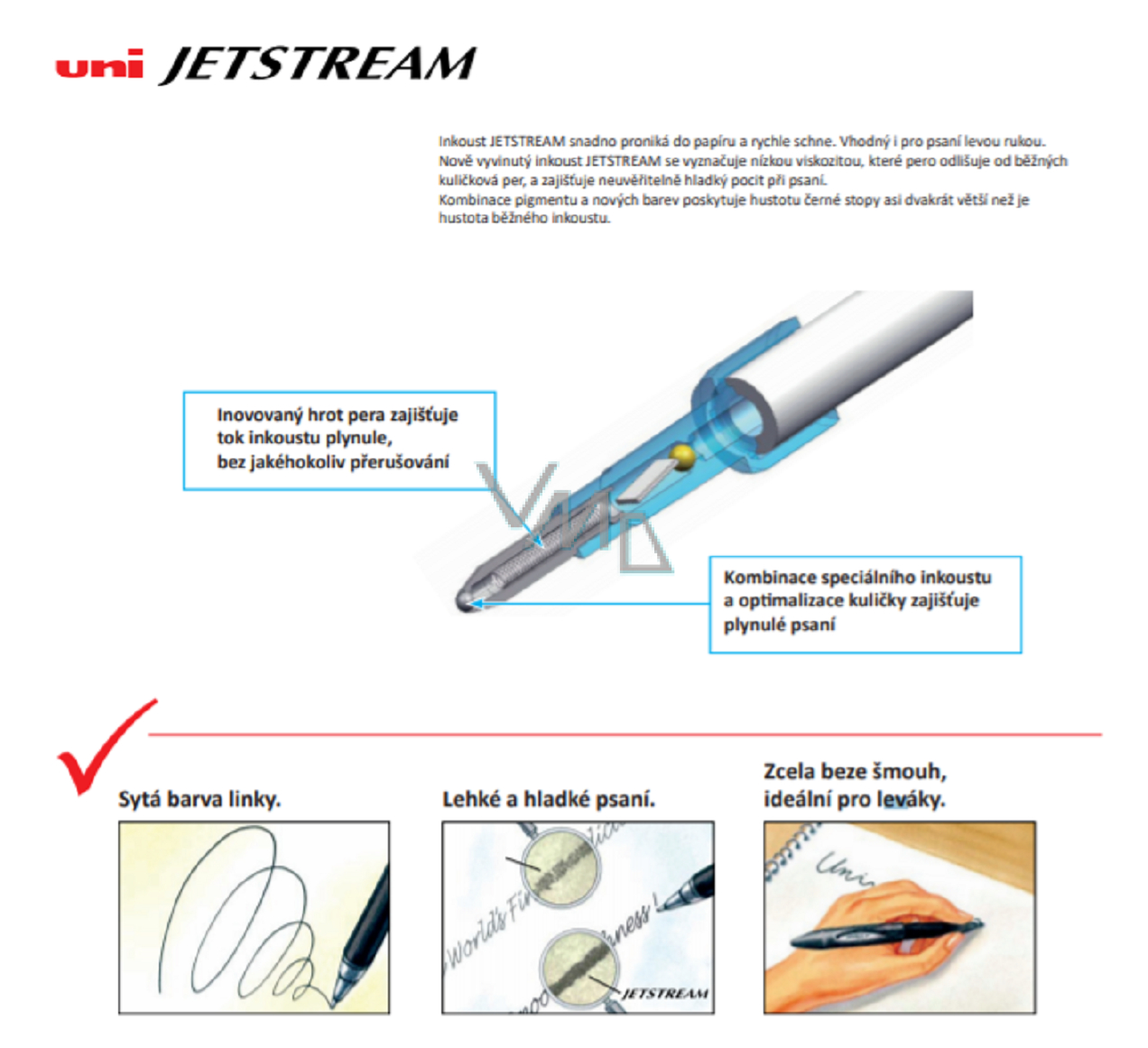 Pera Jetstream využívající jedinečný mechanismus s dvojitou kuličkou uni-ball zajišťují konstantní tok inkoustu bez rozmazání nebo nadměrného vytékání. Jak inkoust prochází špičkou pera, viskozita je snížena mechanismem dvojité kuličky, aby bylo možné hladké psaní. Když se inkoust dotkne papíru, vrátí se do své původní viskozity, aby se zabránilo rozpíjení. Až do poslední kapky inovativní mechanismus s dvojitou kuličkou zaručuje vysoce účinné psaní. Vyrobeno v Japonsku.