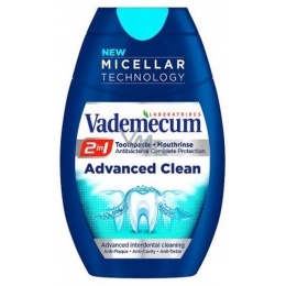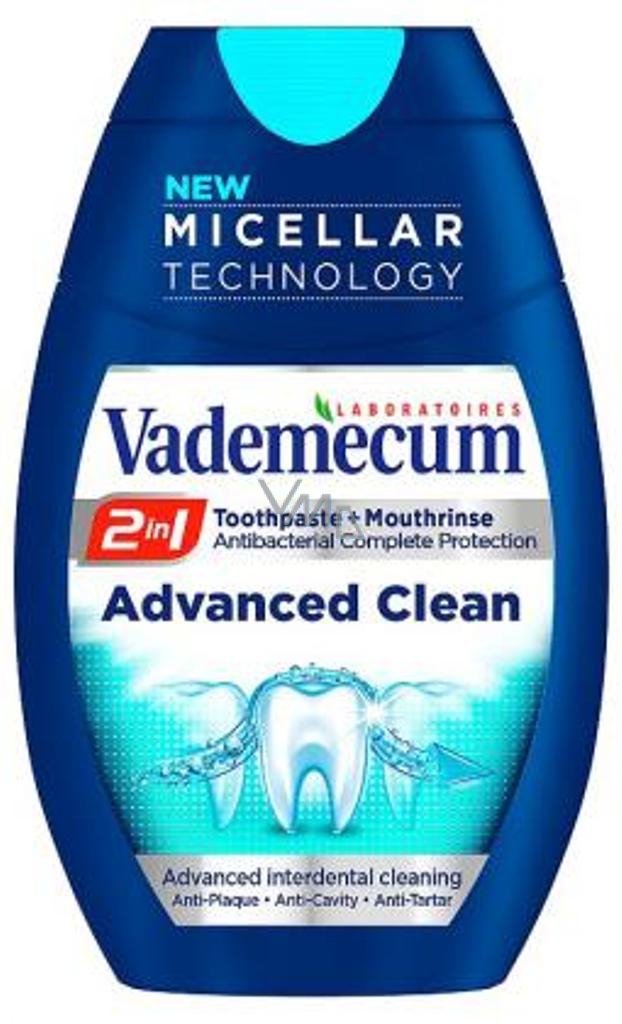 Vademecum zubní pasta 2v1 Advanced Clean: Fluoridová zubní pasta a antibakteriální ústní voda. Hloubková ústní hygiena pro udržení zdravých zubů a dásní a svěží dech.