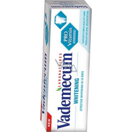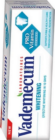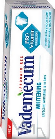 Vademecum Pro Vitamin Whitening díky svému složení rozpouští a odstraňuje zubní plak a skvrny a přispívá k regeneraci bělosti zubů. Zubní pasta Vademecum Provitamin Whitening bělící účinek se projeví již po 10 dnech. Podporuje pevné a zdravé dásně díky přirozené regeneraci. Obsahuje speciální Pro Vitamin komplex, který je kombinací provitaminu E a extraktu ze šalvěje. T
