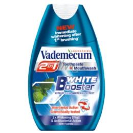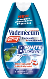 Řada Vademecum 2v1 kombinuje osvědčené zubní pasty Vademecum a antibakteriální ústní vody. Díky tekuté receptuře s klinicky testovaným mezizubním čisticím systémem pronikne nové Vademecum 2v1 i do těch částí ústní dutiny, kam se obvykle kartáček nedostane – jako jsou například mezizubní prostory. A když se smísí s vodou, funguje Vademecum 2v1 stejně jako ústní voda.