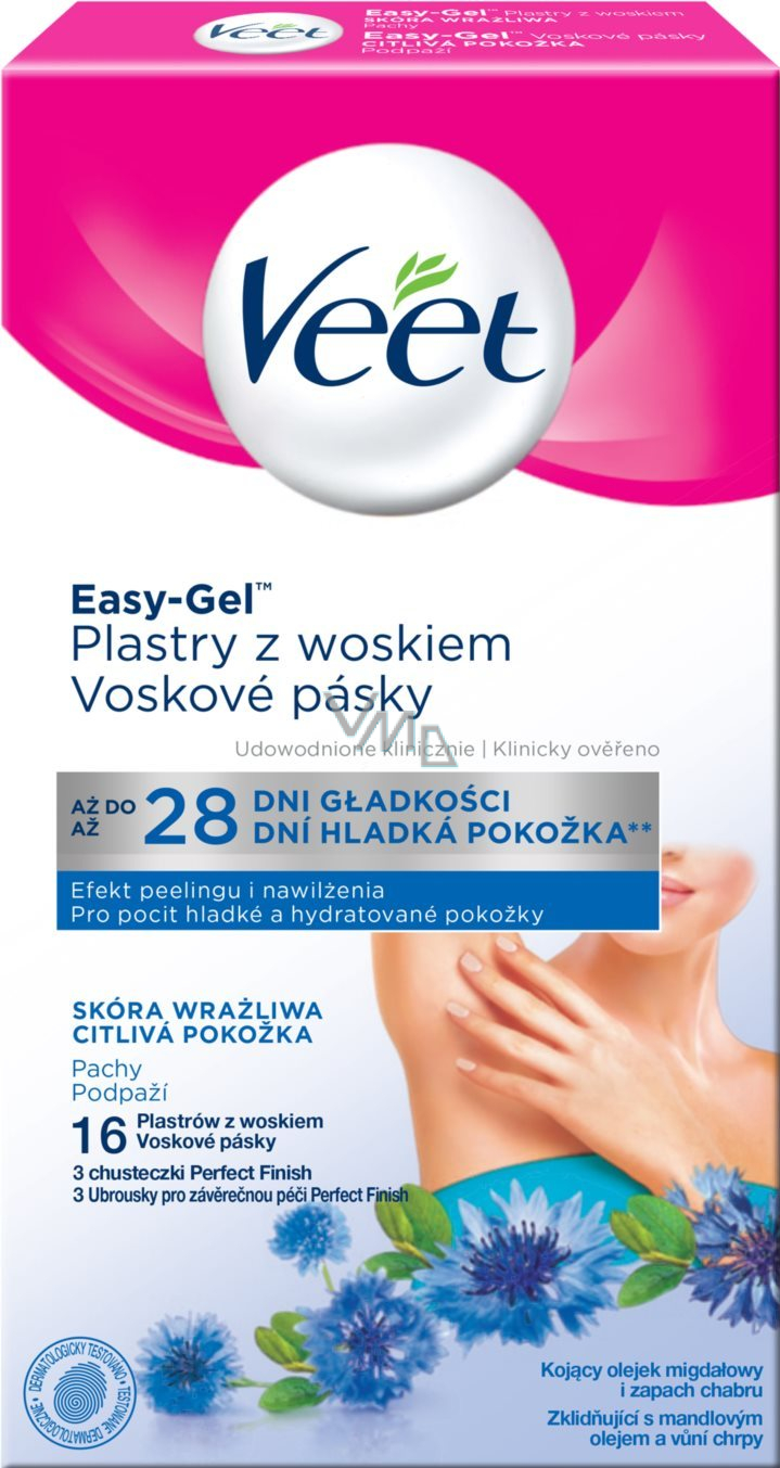 Veet voskové pásky pro citlivou pokožku podpaží a ubrousky pro závěrečnou péči Perfect Finish. Můžete se spolehnout, že dosáhnete skvělých prvních výsledků, i když s voskovými pásky nemáte předchozí zkušenosti. Speciálně vyvinuté složení s přídavkem mandlového oleje, který je známý pro své příznivé účinky na citlivou pokožku, a s vůní chrpy. Užijte si příjemnou gelovou strukturu na pokožce, příjemnou vůni a krásnou barvu.