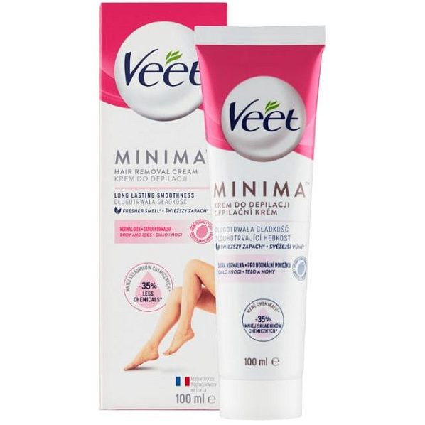 Krem depilacyjny Veet Minima zapewni Ci jedwabiście gładką skórę razem z przyjemnym zapachem. Krem nie tylko skutecznie i doskonale usunie wszystkie włoski i zapewni skórze nawilżenie, które trwa do 24 godzin, ale dzięki nowej technologii jego zapach chroni także przed występowaniem uporczywego nieprzyjemnego zapachu. Z kremem depilacyjnym Veet możesz cieszyć się przyjemnym doświadczeniem nawet podczas depilacji!