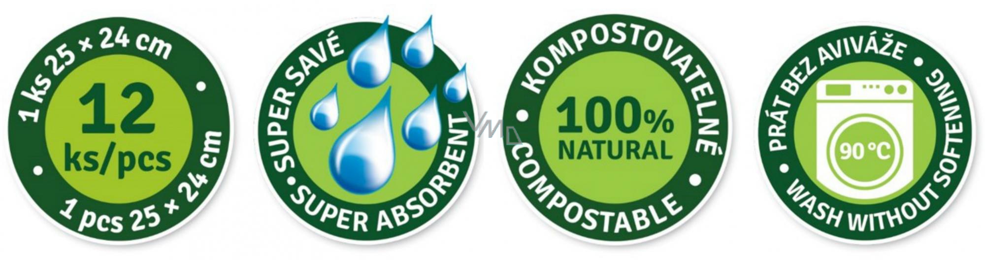 70% celulóza, 30% nebělená bavlna bez GMO. 100% přírodní, certifikované houbové utěrky pro opakované použití.