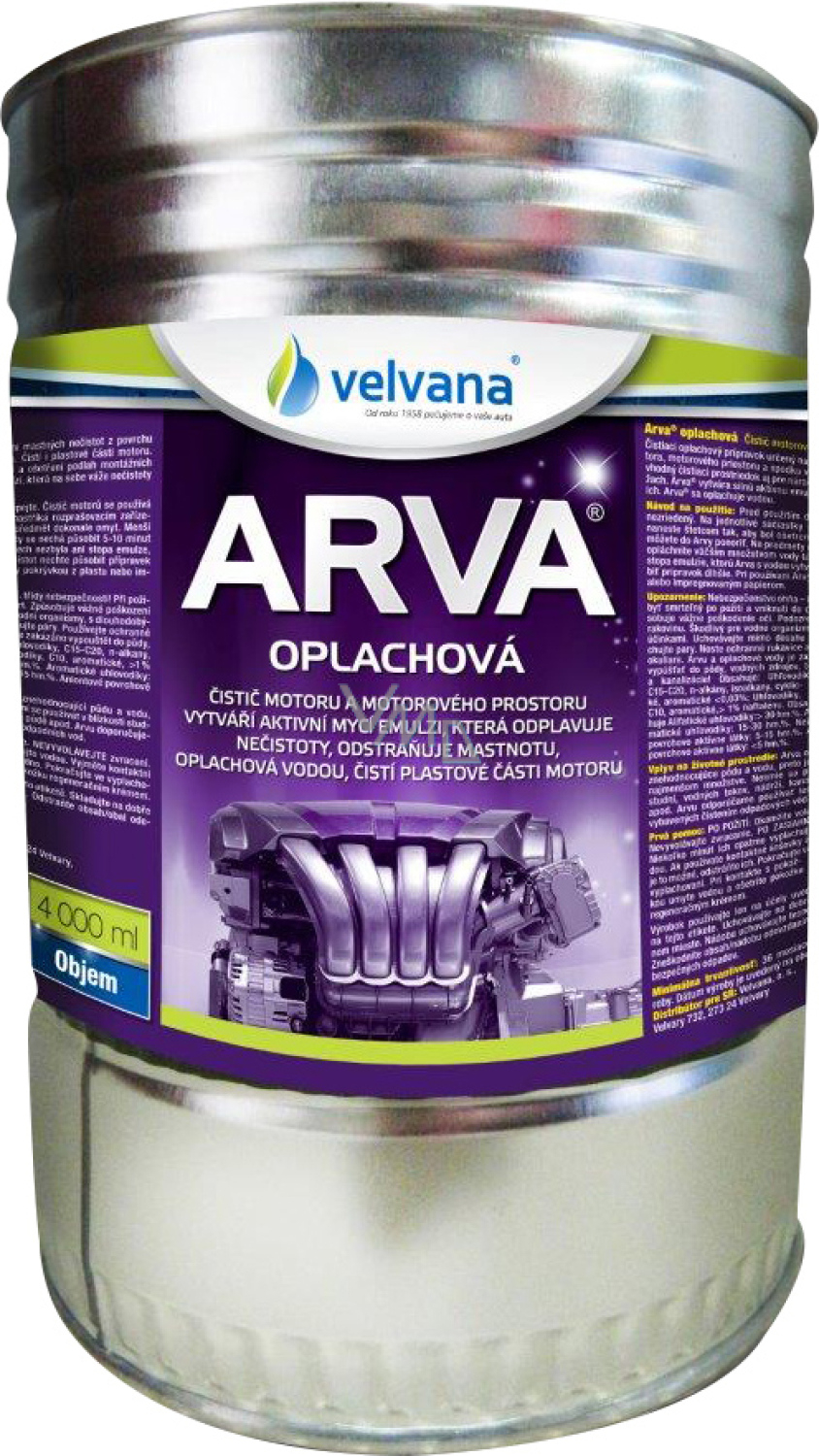 ARVA je aktivní čisticí prostředek k čištění a odmašťování různých kovových předmětů v autoopravárenství, v údržbě vozového parku a dílenských a servisních prostor. Čisticí oplachový přípravek odstraňuje mastné nečistoty z povrchu motoru, motorového prostoru a spodku všech druhů vozidel, stavebních, nákladních a zemědělských strojů.