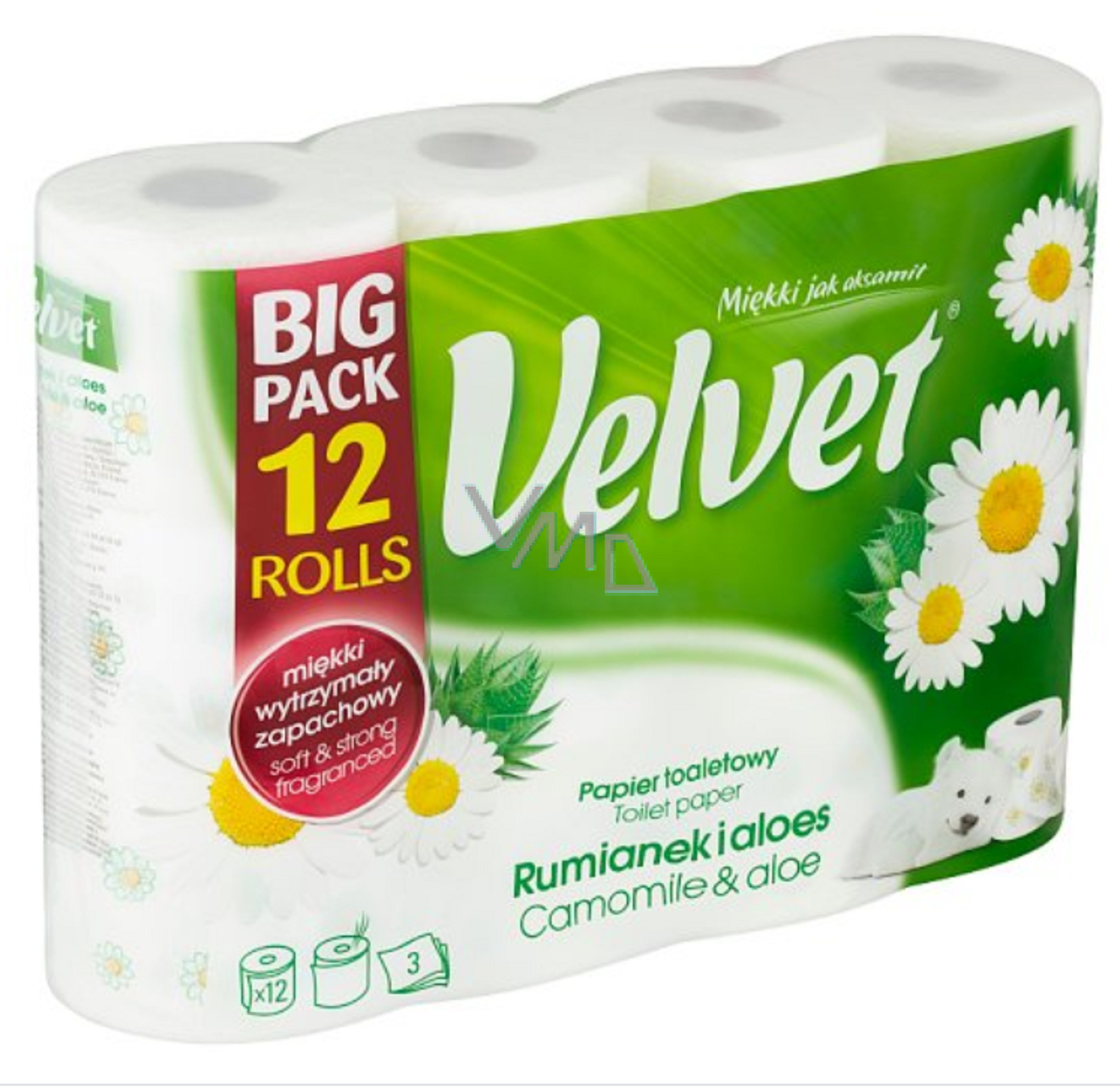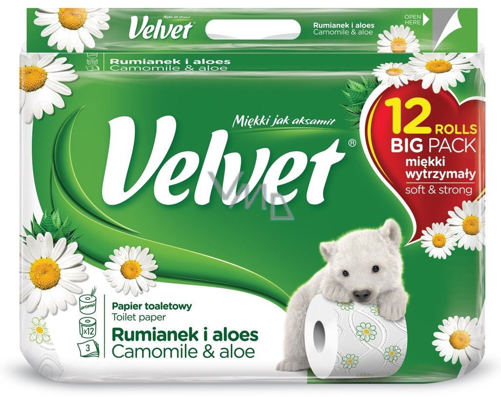Kvalitní 3vrstvý toaletní papír Velvet, je bílý třívrstvý toaletní papír, který je potištěn jemným obrázkem heřmánku a voní po heřmánku. I díky tomu se stal tak oblíbeným v našich domácnostech i kancelářích. Tři vrstvy toaletního papíru poskytují extra jemnost a pevnost.