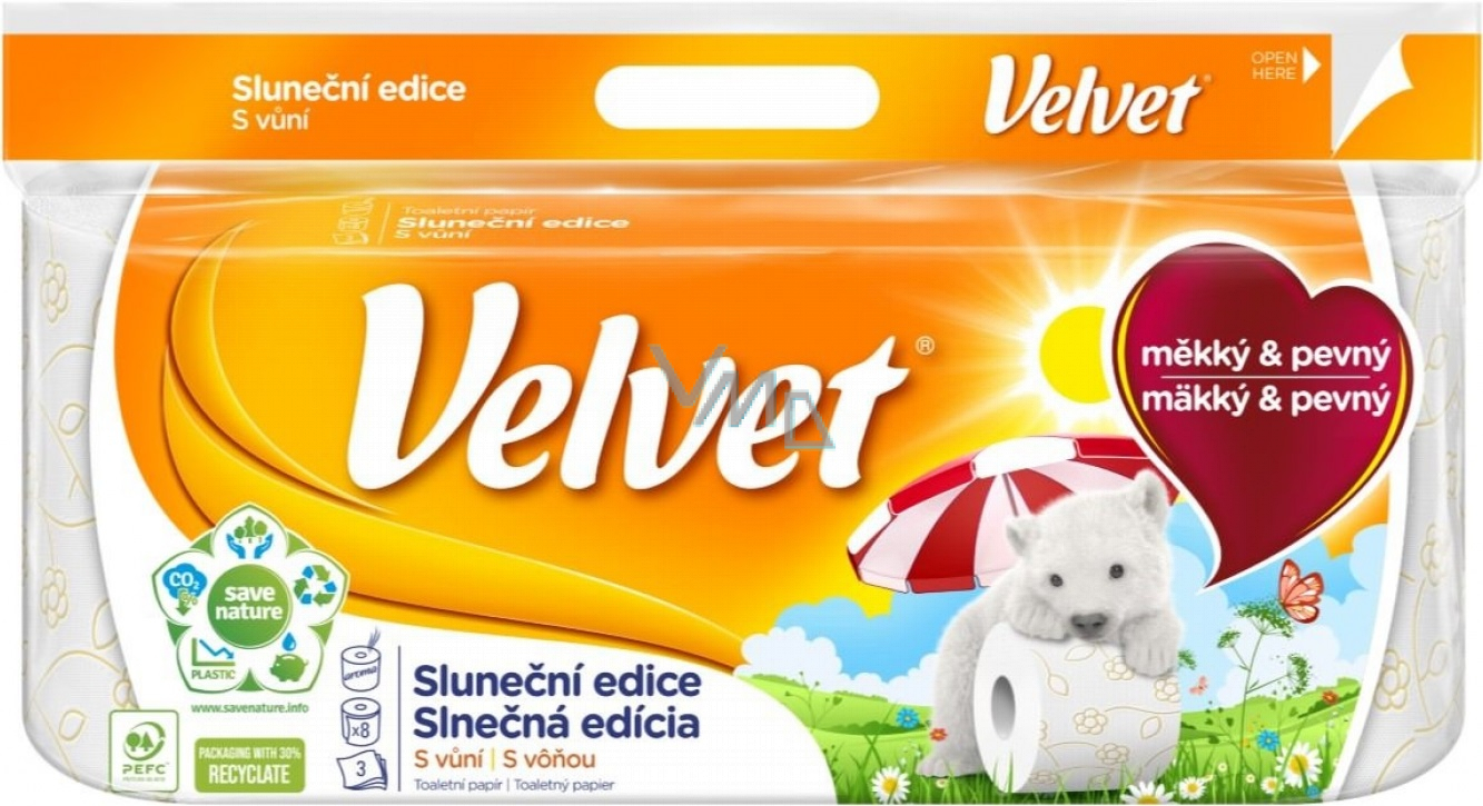 Toaletní papír Velvet je díky materiálu zárukou komfortu a čistoty. Papír vyniká svou měkkostí a hebkostí, zároveň potěší vaše smysly příjemnou vůni. Oku se zalíbí díky jemného květinového potisku, který ve vás nabudí přírodní dojem a doplní tak design vaší toalety. Velkou předností vybraného materiálu je, že vaší pokožce zajistí maximální šetrnost. Toaletní papír Velvet se vyrábí udržitelným způsobem, šetrně využívá zdroje a chrání tak naši přírodu.