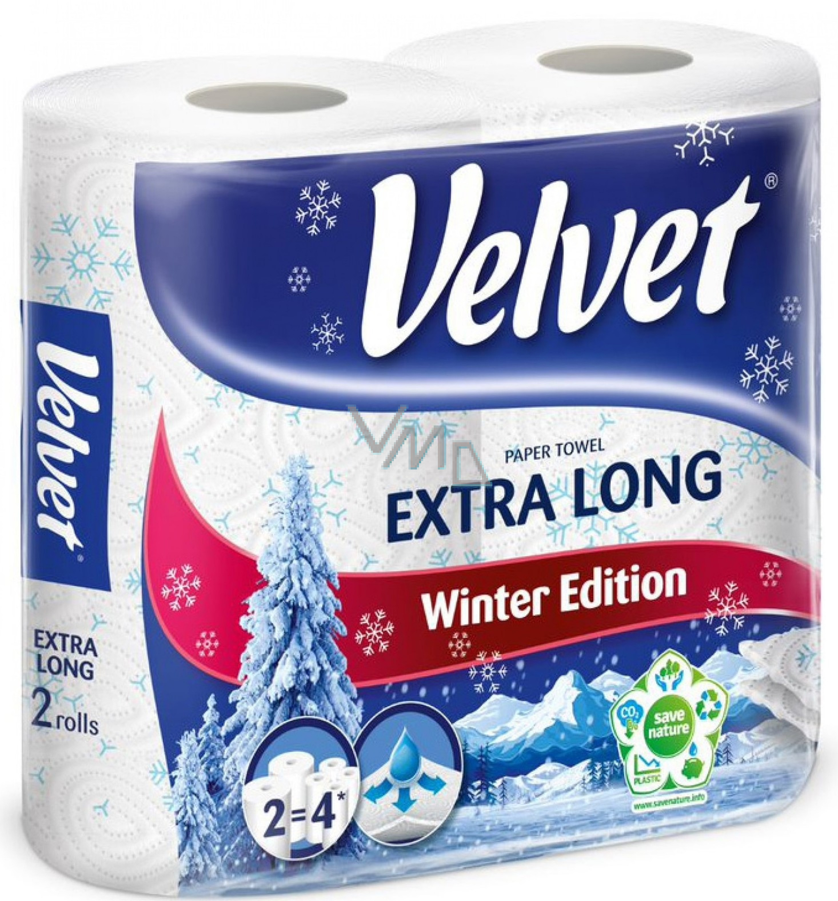 Papírové utěrky Velvet jsou 2vrstvé kuchyňské utěrky se zimním potiskem. Jsou spolehlivé, účinné, savé, měkképevné. Balení obsahuje 2 ruličky, a každá obsahuje 90 útržků.