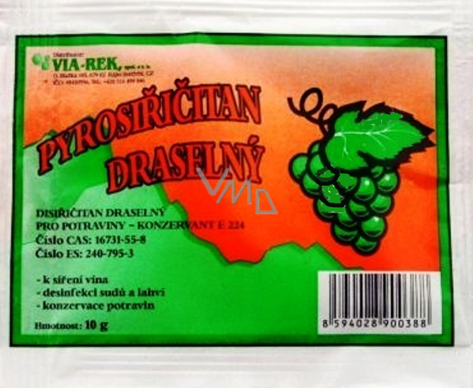 Dávkování: 1 g Disiřičitanu draselného představuje 0,575 g účinné látky - oxidu siřičitého.
