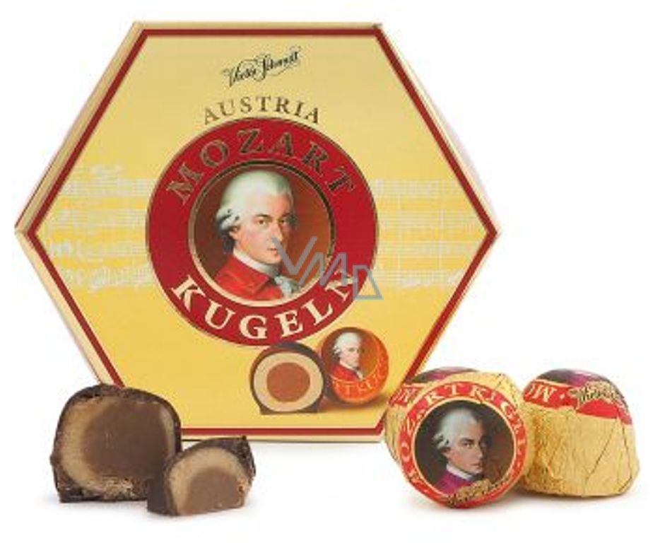 - Kulička zabalená ve zlatém staniolu s obrázkem Wolfganga Amadea Mozarta.