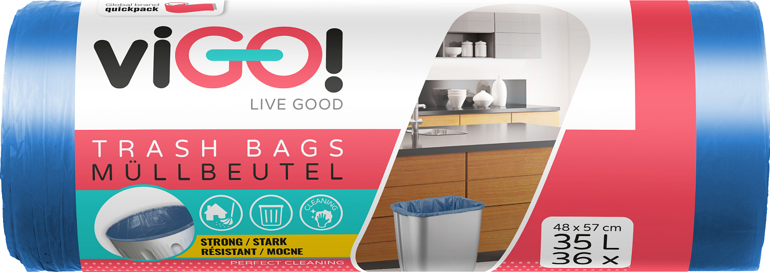 Niebieskie worki na odpady o pojemności 35 litrów i rozmiarze opakowania 36 sztuk. Każdy sztuka ma rozmiar 48 × 57 cm.