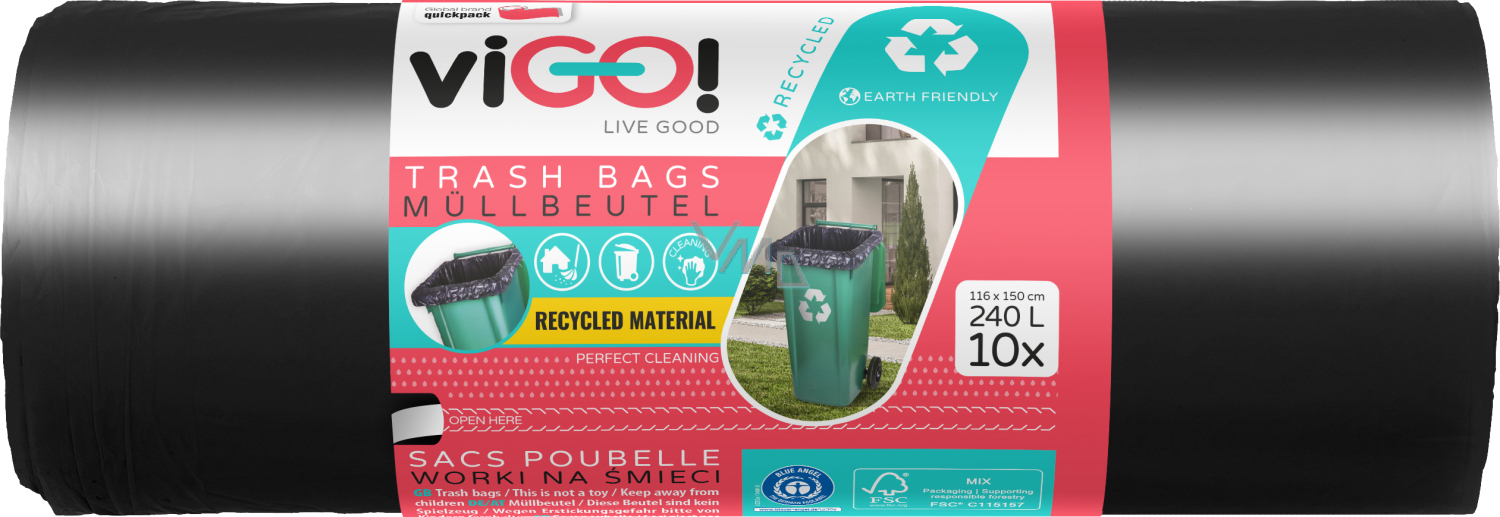 Quickpack worki na śmieci, mocne 28 µ, rozmiar worka 116 × 150 cm, pojemność 240 l, opakowanie 10 sztuk. Wysokiej jakości worki na śmieci do przechowywania odpadów z domu lub ogrodu.