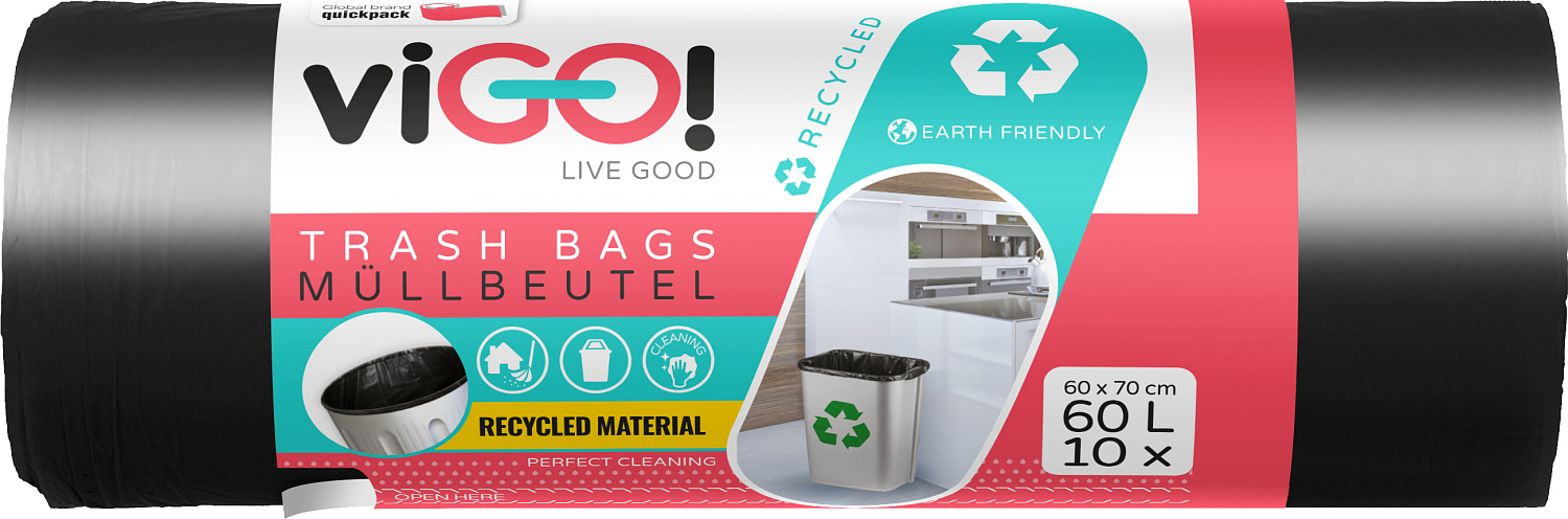 Quickpack viGO worki na śmieci, mocne 24 µ, wymiar worka 60 × 80 cm, pojemność 60 l, pakowane po 10 sztuk. Wysokiej jakości worki na odpady do przechowywania odpadów z gospodarstwa domowego lub ogrodu.