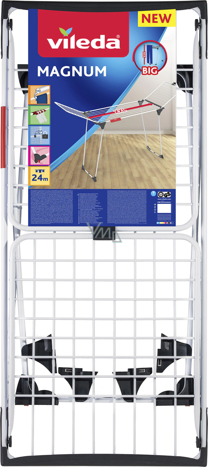 Suszarka do bielizny Magnum marki Vileda jest wyjątkowo dużą wewnętrzną suszarką do bielizny ze składanymi skrzydłami, która oferuje przestrzeń dla aż 3 pralek. Z powierzchnią do suszenia 24m i skrzydłami o wysokości do 1,28 m, suszarka Vileda Magnum jest idealna do codziennego prania i dużych kawałków bielizny. Extra mocne druty XXL zapobiegają pognieceniu odzieży, co ułatwia późniejsze prasowanie.