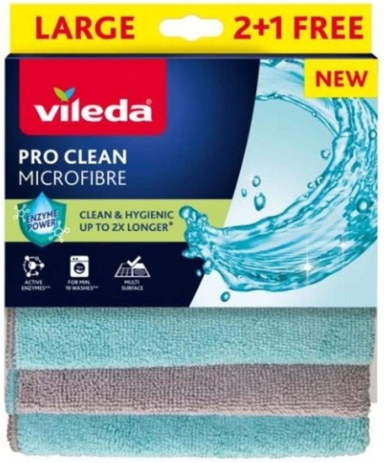 Vileda Pro Clean mikro ściereczka jest wysokowydajnym środkiem czyszczącym zaprojektowanym do codziennej konserwacji domu. Dzięki mikro włóknom i innowacyjnej obróbce z wykorzystaniem naturalnych enzymów skutecznie usuwa brud, kurz i tłuszcz, a jednocześnie jest delikatna dla powierzchni. Opakowanie zawiera 3 szt. – 2 standardowe i 1 gratis, co oferuje korzystny stosunek ceny/jakości.