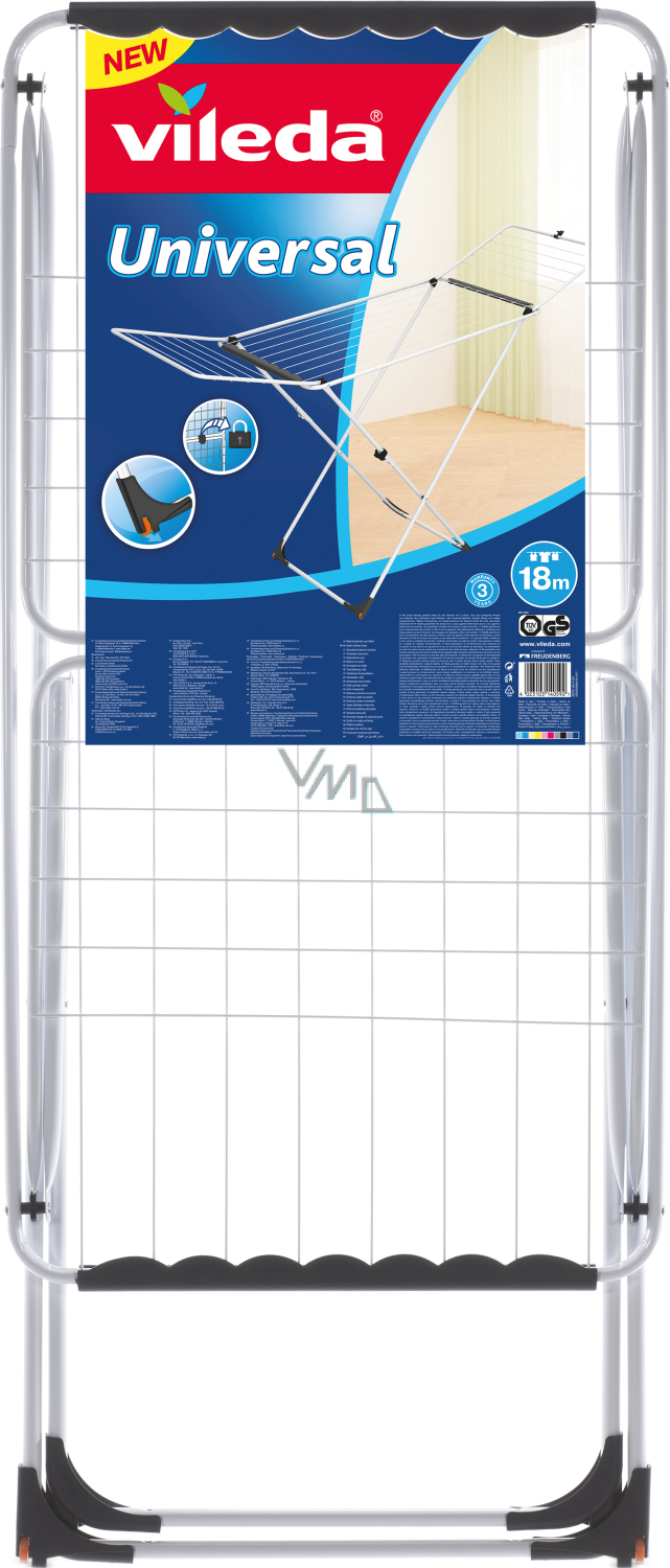 Vileda Universal suszarka oferuje 18 metrów powierzchni do suszenia, co ułatwia suszenie codziennej bielizny. Jest wyposażona w praktyczne akcesoria do wygodnego użycia. Łatwe i szybkie otwieranie i zamykanie dzięki składanym nogom. Bezpieczny zawias, który zapobiega przypadkowemu złożeniu suszarki podczas transportu. Bezpieczny zamek skrzydeł bocznych pozwala na wygodne i bezpieczne przechowywanie lub powieszenie - podczas składania skrzydła utrzymują się na swoim miejscu i zapobiegają ich samoistnemu otwieraniu. Solidna stalowa rama z mechanismem bezpieczeństwa, kółka do łatwego przemieszczenia.