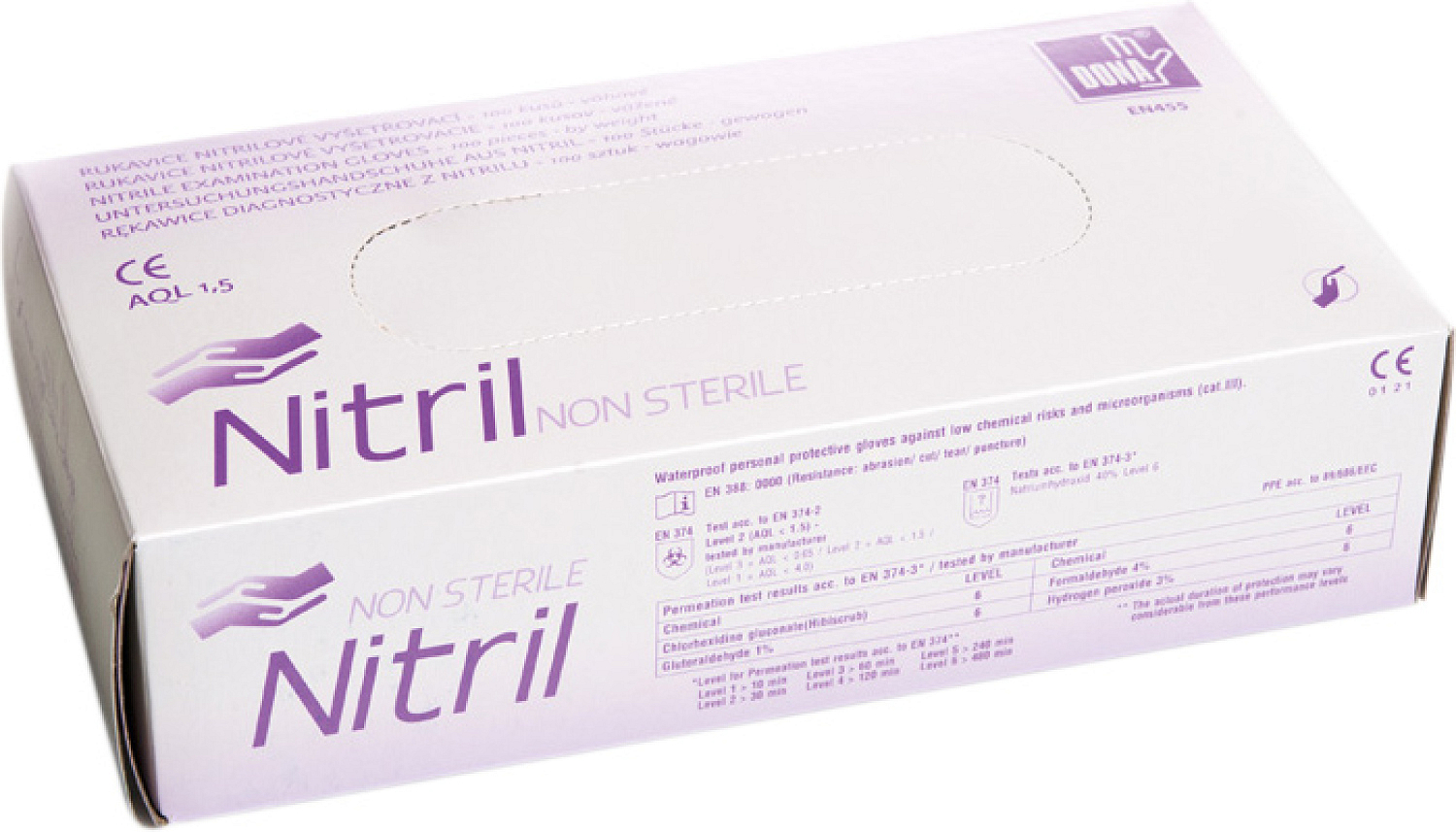 Dona jednorazowe rękawice nitrylowe bezpudrowe.
