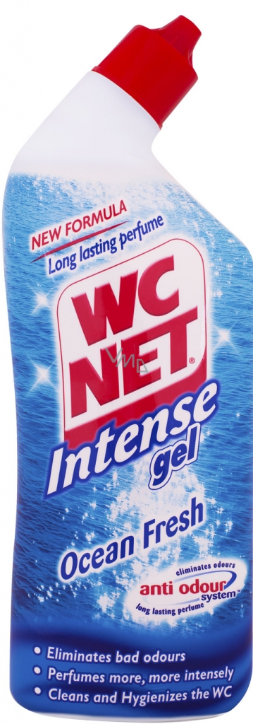 WC Net Bleach Ocean Fresh - jedná se o novou kombinaci bělidla a sody bicarbony, která zajistí dokonale zářivou bělost toalety bez matného povlaku. Díky nové formulaci je přípravek ještě gelovější, tím lépe přilne k povrchu, kde čistí a bělí. Díky zahnutému hrdlu a přímému nalévátku se dostane WC gel až pod okraj vaší toalety, přilne na stěně a odstraní zárodky a bakterie, čímž zajistí 100% hygienu.