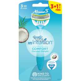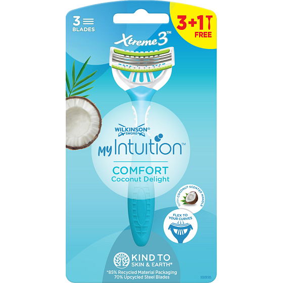 Elastyczna głowica dopasowuje się do konturów Twojego ciała i precyzyjnie usuwa włoski. Nałożony pasek nawilżający zawiera emulsję z olejem kokosowym, aloesem i witaminą E, dzięki którym skóra staje się delikatniejsza i dobrze nawilżona. Opakowanie zawiera 4 sztuk damskiej maszynki do golenia Wilkinson Xtreme 3 Comfort Coconut Delight.