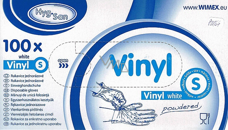 Wimex Rukavice hygienické jednorázové vinylové pudrované bílé, velikost S, box 100 kusů