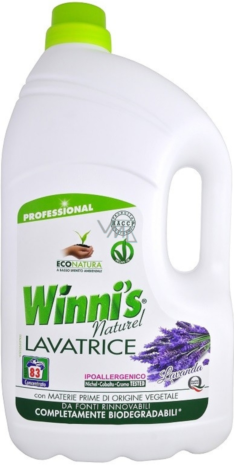 Sháníte ekologický prací gel rostlinného původu? Zvolte WINNI´S Lavatrice Lavanda Ecoformato. Tento hypoalergenní prací gel obsahuje mýdlo rostlinného původu s vůní Levandule. Je vhodný na všechny typy vláken, na jemné i barevné oděvy včetně dětského prádla. Dokáže odstranit všechny skvrny a nečistoty. Jeho účinnost se projeví již při 30 °C. Stejně tak jej můžete použít na vyvářku při 90 °C