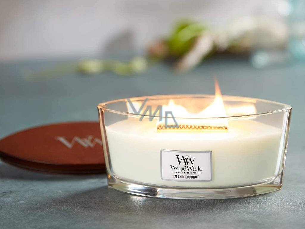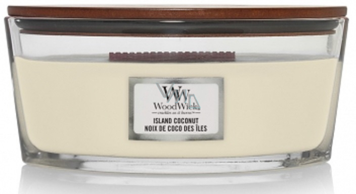 WoodWick Island Coconut - Kokosowa wyspa świeca zapachowa z drewnianym szerokim knotem i wieczkiem szklanym 453 g